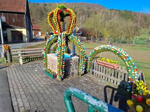 Rund um den Osterbrunnen am Marktplatz werden allerlei Produkte aus der Region und österliche Geschenk- und Dekorationsartikel angeboten.